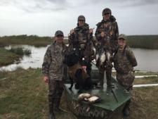 This hunt was a reunion of friends and family who hunted together back in our high school days over 20 years ago. We could not have scripted a better hunting day than experienced with Pipkin and Tony this past December. It began with a foggy, cool ride in an airboat which was a first time ride for most of us. The adrenaline rush from an airboat ride to start the day easily supersedes any that a cup of joe can provide and with a quick step from the boat to the blind we were all anxious to get started. The fog was so dense our safe light was pushed out over 30 minutes past normal and eventually we could begin to make out the ducks we had been hearing drop in on us since our arrival. The natural blind was well constructed, blended in perfectly and was comfortable. We all paused for a moment to join in on a Jackson prayer to thank God for our Texas blessings and to provide us all safe adventures. Once Tony started working the call it was fast action that made Shiner one happy dog. The morning was all that more special watching a well-trained dog like Shiner work and despite our midway shooting abilities collapse we were all limited out in a little over 2 hours. We spent some time gathering dekes while reliving our morning experiences and watching the ducks continue to fly in. After a few pictures and some good laughs (in the future face paint will go on before we get in the field) we all loaded up for an enjoyable ride back in. We would like to thank Pipkin Outfitters and Tony for making this hunting reunion a memorable one. Pencil us in for a couple next year, we will be there.